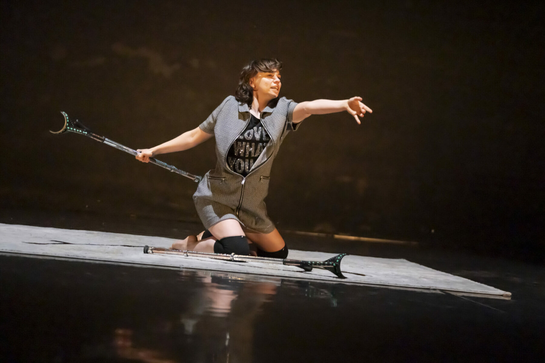 Le solo propose une réflexion sur l’après, sur ce qui reste quand la fête est finie et le besoin de connexion persistant. The After Party est une célébration du ridicule et du sublime dans les moments d’entre-deux. Chaque mouvement, chaque chute ou dérapage, raconte une histoire absurde : la chute des attentes sociales, la répétition mécanique des plaisirs perdus, et la rencontre avec un nouveau monde où le bizarre est devenu la norme. Elle incarne avec humour cette figure de la « reine déchue de la fête », à la fois comique et attachante, qui refuse de lâcher prise, bien que tout semble déjà parti à la dérive.