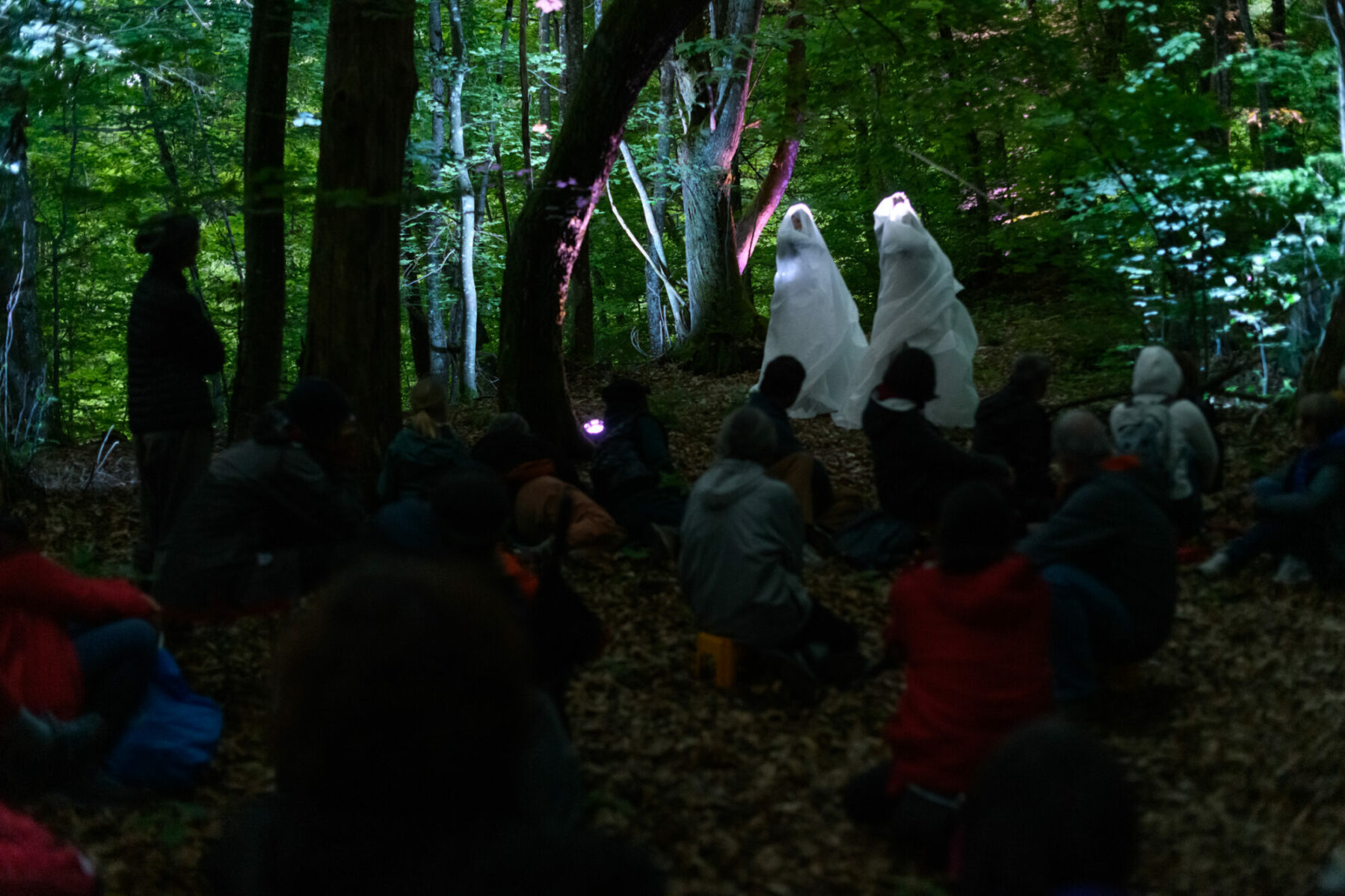 Habitants visibles et invisibles de la forêt, animaux que l’on entend, que l’on devine, qui nous respirent, branches qui chantent au souffle du vent, êtres surnaturels, présents sous une pierre, au fond d’un ruisseau ou au coeur du brouillard, tous sont conviés au spectacle. La pièce souhaite remettre l’homme à une plus juste place, espèce parmi les espèces, partie d’un tout qui le dépasse, incapable de se mettre au rythme d’un chêne ou d’un torrent, d’écouter les paroles du vent ou la voix de l’écorce. La danse organique et puissante de Nathalie Pernette nous prend par la main et nous amène dans une balade enchantée à la fin du jour, au début de la nuit. Wi, c’est la peau des arbres, incarnée par les corps et les coeurs des danseurs, et peut-être les vôtres aussi ?